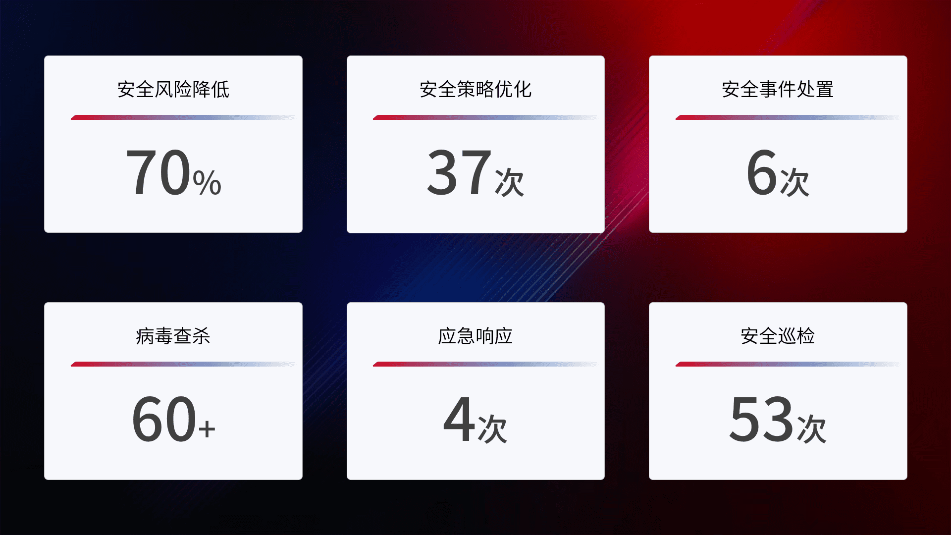 提供全面的安全事件报告体系,,,包括处置报告、、、、周报、、、季度和年度总结,,,结合持续监控,,,,帮助客户深入了解网络安全状况。。。。